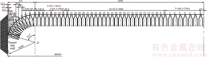 According to the technical engineering requirements and corresponding cutter-head structural design requirements, a medium square five-section cutter-head was taken as a case; the radial and circumferential model of the cutter layout were established. GUO et al [7] has established the radial model. In the radial layout design of cutters, First, to leave the center cutters and normal cutters’ installed area unchanged in the TBM cutter-head’s original design scheme, a new method of determining the installed obliquity range for the gage cutters was proposed by taking the bearing stress of the outermost gage disc cutter as an evaluation index. Then the profile was determined according to the relationship between the size of the cutter-head’s transition zone, the fillet radius and the installed tilt angle. Next, the formulas for the rock-breaking amount for cutters with a constant cross section and for calculating wear extent for gage cutters were derived. On this basis, using a genetic algorithm, based on the principle of equal life, the assembled radiuses of the center cutters and normal cutters were optimally designed; based on the principle of equal wear, establishing a nonlinear mathematics model, the tilt angles of the gage cutters were also optimally designed. Based on these results, the circumferential model was established continuously for the circumferential layout design of cutters. The boundary conditions of non-interference between cutters, manholes, muck buckets and welding lines in the radial and circumferential direction were given when star layout pattern was used on cutters. Based on this, a comprehensive cutter-head evaluation model was established by taking the cutter-head’s unbalanced radial force, overturning moment and the cutter group’s centroid shift as evaluation indices. A new method for cutter layout was proposed accordingly. Finally, exemplifying the MB264-311-8030 mm type TBM cutter-head in the draw water tunnel project of Liaoning Dahuofang Reservoir, the feasibility and effectiveness of the model were verified by designing its transitional arc area and arranging its cutters in the radial and circumferential directions.