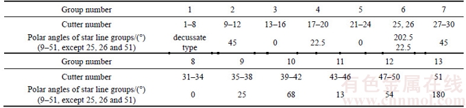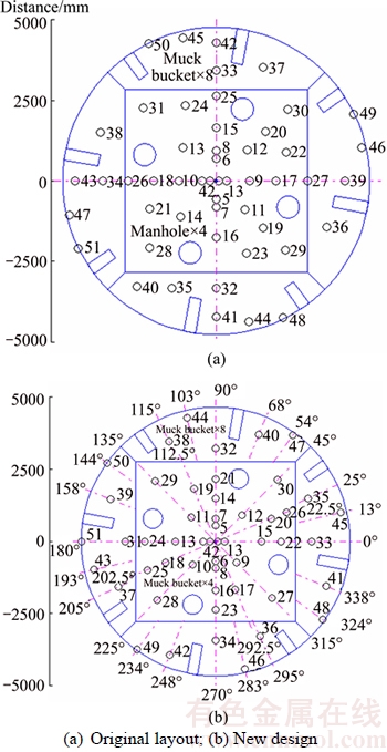 The arrangement of the cutters on the cutter- head consists of the radial and circumferential arrangement. GENG et al [17] have established related models: the optimum designs of the polar radii for the center cutters and normal cutters were created based on the principle of equal life; the optimum design of the tilt angles for the gage cutters were established based on the principle of equal wear; and an adaptive design method based on the profile of the cutter-head was proposed. On this basis, the polar angles were optimized by using the cutter circumferential layout method and the cutter-head comprehensive evaluation model, and the resulting cutter layouts are shown in Figure 19.