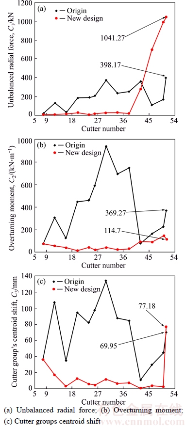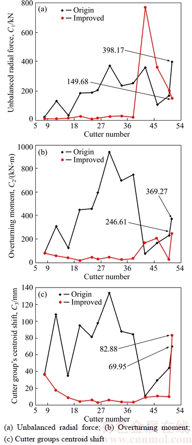 GENG [17] pointed out that the main consideration in the project is minimizing the overturning moment; this is followed by the unbalanced radial force, and lastly the centroid shift of the cutter group, so that C2>C1>C3 in importance.