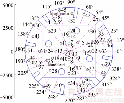 The medium square five-section cutter-head was taken as a research object and the star layout pattern was adopted; Figures 5(b) and 6(c) show that when the cutters are arranged on the cutter- head in a circumferential direction, they are restricted by many constraints. According to the different constraint directions, they can be divided into two categories: radial and circumferential constraints. With radial constraint, cutters must not interfere with horizontal and vertical welds; the circumferential constraint requires there to be no interference between cutters, and the cutters cannot interfere with the muck buckets, manholes and 45°welds.