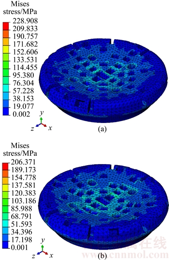 As shown in Figure 23, the maximum equivalent stress in the original layout is 228.908 MPa, and in the approved layout is 206.371 MPa; the latter is smaller, because the distribution of the cutters in the approved layout is more uniform and scattered, avoiding excessive stress concentration of the cutter-head.