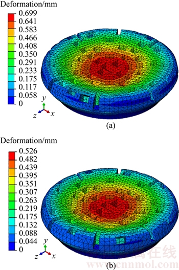 As shown in Figure 24, the deformations decrease gradually from the center to the edge of the cutter-head and the deformation contours are concentric in both layouts. The maximum deformation in the original layout is 0.699 mm and in the approved layout is 0.526 mm; the approved layout gives the cutter-head greater structural stiffness.