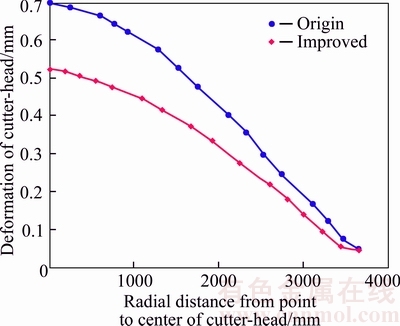 The deformation on the positive of the X axis is shown in Figure 25. The deformation is smaller and changes more gently along the radial direction of the cutter-head in the approved layout than in the original layout.