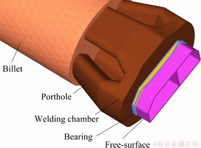 The FE model for simulating the porthole die extrusion process of a profile was established using the HyperMesh software (Fig. 3). The efficiency of element generation and the quality of the element were improved by dividing the entire model into several continuous regions, namely, billet, porthole, welding chamber, bearing and free-surface. For the transient-state analysis, the length of the free surface of the extruded profile was three times that of the die bearing, and that of the billet was two times the inner diameter of the container. The mesh continuity of different components was ensured by using a setup where the basic principle of mesh generation was from small to large and the meshing order was bearing → welding chamber → porthole → billet. To improve the accuracy and speed of simulation, a pentahedral mesh was used for the free surface and bearing, whereas a tetrahedral mesh was utilized for the billet, porthole and welding chamber. At least four free nodes were present at the thinnest section of the profile. The element size was not larger than 1/5 of the thinnest size of the profile and the length/width ratio of the pentahedral mesh for the die bearing was lower than 3. In general, the element size of the welding chamber was 2.5 times that of the bearing, the element size of porthole was three times that of the welding chamber and the element size of the billet was three times that of the porthole.