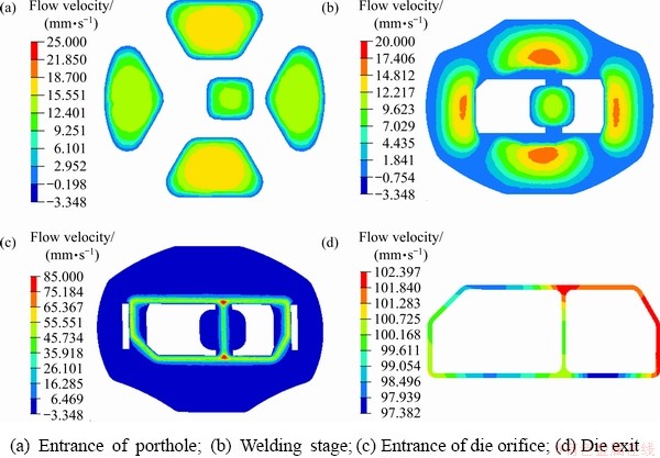 The material flow behavior during the entire extrusion process through the porthole die was analyzed. Figure 7 shows the flow behavior of the material at different stages of the porthole die. The colour depth and change reflected variations in flow velocity. The blue colour represents small velocity, whereas the red colour represents high velocity. The material flow velocity in contact with the container and porthole die surface is far lower than that at the die centre due to the strong adhesive friction. The difference between the maximum and minimum velocities of the material on the cross-section of the die exit is 5.02 mm/s, which indicates the uniform material flow velocity during the porthole extrusion process. The material supplies in different parts of the die cavity are reasonable, and the velocity distribution is relatively balanced. Therefore, the uniformity of temperature distribution on the cross-section of the extrudate is ensured.