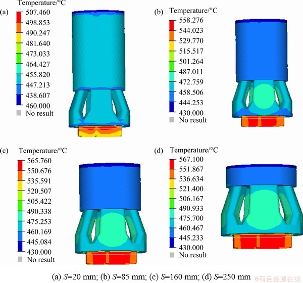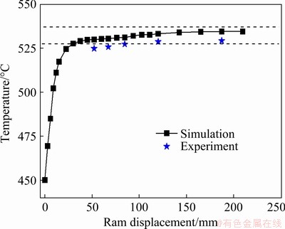 Fig. 8 Temperature variation of profile during transient extrusion at extrusion speed of 10 mm/s and different ram displacements