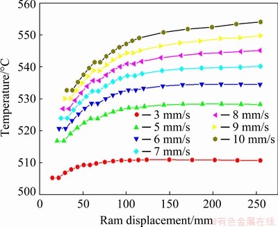 Fig. 9 Temperature change of profile cross-section at die exit with ram displacement after extrusion at different extrusion speeds