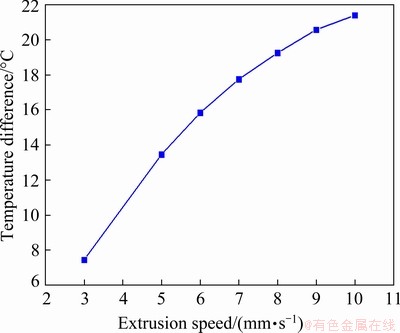 Fig. 10 Temperature difference of profile cross-section along extrddate length at different extrusion speeds