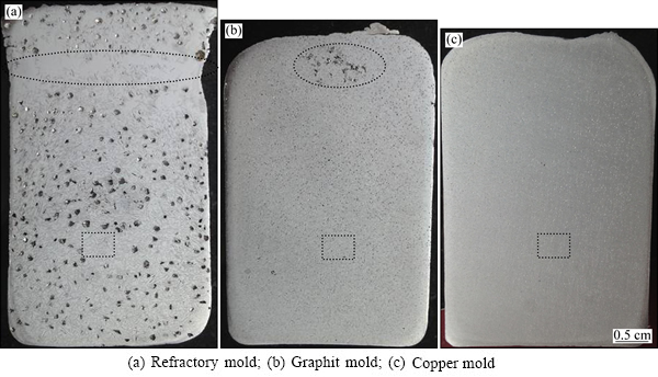 3种不同铸模中凝固的Al-5Zr中间合金的宏观形貌如图3所示,其中图3(a)、(b)、(c)所示分别为耐火模、石墨模以及铜模凝固试样竖直纵截面的宏观形貌,可以看出3种凝固条件下获得的铸锭的宏观形貌存在明显的差异。耐火模凝固试样上表面与模壁接触处几乎呈直角,无明显的缩孔,而在侧面距离上端约1 cm附近出现了一个明显的“缩径”,这表明此处是试样最后凝固的位置,耐火模试样纵截面上存在大量尺寸较大的圆形气孔,这些气孔的平均直径在0.8 mm左右,在基体中还分布着大量长条状黑色初生相,在“缩颈”处试样的内部黑色初生相与气孔数量均较少(见图3(a))。石墨模试样的上表面与模壁接触处呈圆角,试样中部距离上表面附近存在一个有较多大尺寸气孔聚集区,试样中其他区域存在着大量分布均匀的圆形气孔,这些气孔的尺寸明显较耐火模试样的小,而气孔的数量明显较耐火模试样的多,基体中的黑色相的大小已难以通过肉眼辨别。铜模凝固试样的外形与石墨模试样相似,但在上表面上有一个比较明显的缩孔,试样纵截面上分布着大量均匀细小的气孔,基体中的初生相无法用肉眼辨别。