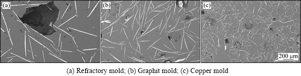 不同试样测温点位置附近(对应图3中虚线框处)的SEM像如图4所示。由图4可以看出,3种铸模凝固试样内均有大量白色的条状相,但不同试样中的相的尺寸明显不同。耐火模试样中的白色相尺寸最为粗大,长度可达600~700 μm(见图4(a));石墨模试样中白色相的尺寸较耐火模的明显减小(见图4(b)),其长度多为200~300 μm;铜模冷却条件下,试样中白色相的尺寸最小,长度均在200 μm以下(见图4(c))。