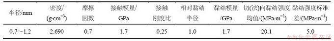 本文的参数标定过程使用了前文所述的类岩石材料的单轴压缩试验。图1所示为标定结果,两者的宏观参数基本吻合。物理试验加载初期会有裂隙压密阶段即试验曲线的上凹部分,考虑到本文的研究内容标定过程并未对其进行处理。模型材料的宏观的参数为:单轴抗压强度为24 MPa, 弹性模量为3.7 GPa,砂粒最大半径为1.25 mm。主要的微观参数如表1所示。