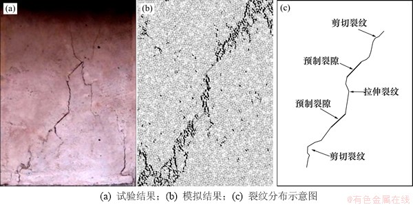 为验证该数值模型的有效性,本文进行了含2条预制裂隙类岩石试件的单轴压缩试验(图2(a)所示为物理试验破坏后的结果)。该试件的破坏模式是典型的拉剪复合破坏[12]。采用前文所述的微观参数建立相应的数值模型,进行数值模拟单轴压缩试验,试件破坏后结果如图2(b)所示。数值模型中的产生的拉伸裂纹和剪切裂纹与试验及理论结果相符(图2(c)所示为裂纹的分布图),从而可以使用该模型深入研究断续节理岩体破坏机制。