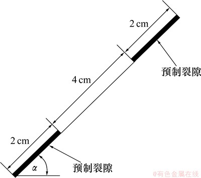 首先进行了预制裂隙类岩石材料的模型试验, 进而作为数值试验模型的依据。本次试验试件由白水泥、细沙和水制作而成,模型试件尺寸(高×宽×厚)为 200 mm×150 mm×30 mm。各组分配比(体积比)为:V(白水泥):V(细沙):V(水)=2:1:1。使用0.4 mm厚铝合金薄片在试件中部预制裂隙, 建立断续节理模型试件。
