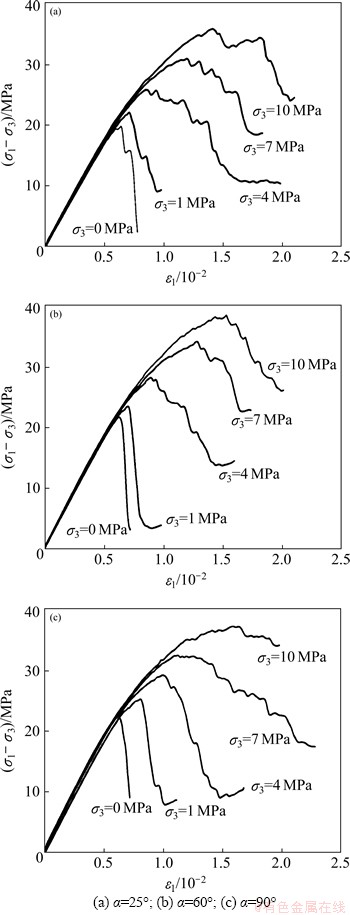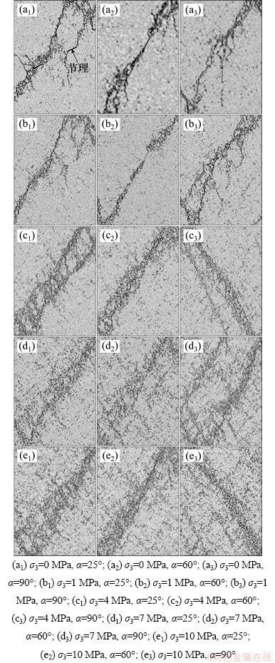 由图6(a)(σ3=0 MPa)可知:岩体中的断续节理决定了岩体的断裂形态;当α=25°时,裂隙尖端翼裂纹发育并朝向最大主应力方向扩展,最终形成了主要破坏面;岩体的破坏主要是一条裂隙尖端翼裂纹扩展的结果;α=60°岩体内次生共面裂纹在岩桥区快速发展、贯通,导致了岩桥剪切破坏,岩体很快沿着节理面剪切滑动,试件破坏;α=90°的岩体内产生了劈裂纹,但没能延伸到试件端部,试件就已破坏。可见,节理倾角决定了岩体的破坏形态;当σ3=1 MPa时,岩体的破坏模式和σ3=0 MPa时没有本质的区别,但裂隙尖端发展的翼裂纹受到围压的抑制作用而明显减少;当σ3= 4 MPa时,由裂隙尖端引发的翼裂纹、次生裂纹的数量及其影响变小,裂纹在岩体内分布得更加均匀和广泛;当围压达到一定程度(σ3≥7 MPa)后,节理的影响已经很小,试件的破坏模式为沿剪切面的滑移破坏。