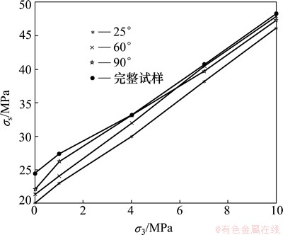 对不同围压下断续节理岩体峰值强度σs的数据进行整理,结果如图5所示。从图5可见:各倾角下的岩体的峰值强度与围压存在着明显的线性关系,其相关系数接近于1(各相关性系数均大于0.994);随着围压的增加,岩体的强度增加,而且各节理岩体的强度的差别逐渐减少并接近于完整岩体的强度。