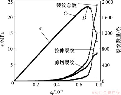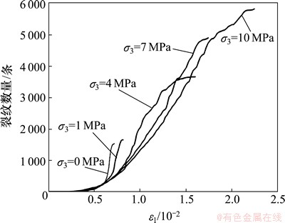 由图8可知:不同围压下的裂纹初始产生阶段近似一致(图8中应变ε1约0.6×10-2以前部分为裂纹初始产生阶段)。这表明在这个阶段岩体内部损伤演化过程和围压无关或作用很小;随着围压的增加,裂纹数量曲线变平缓(裂纹快速发展阶段和破坏后阶段),也就是围压抑制了裂纹的扩展。但随着围压增加,岩体破坏过程更加漫长,最终产生了更多的裂纹。
