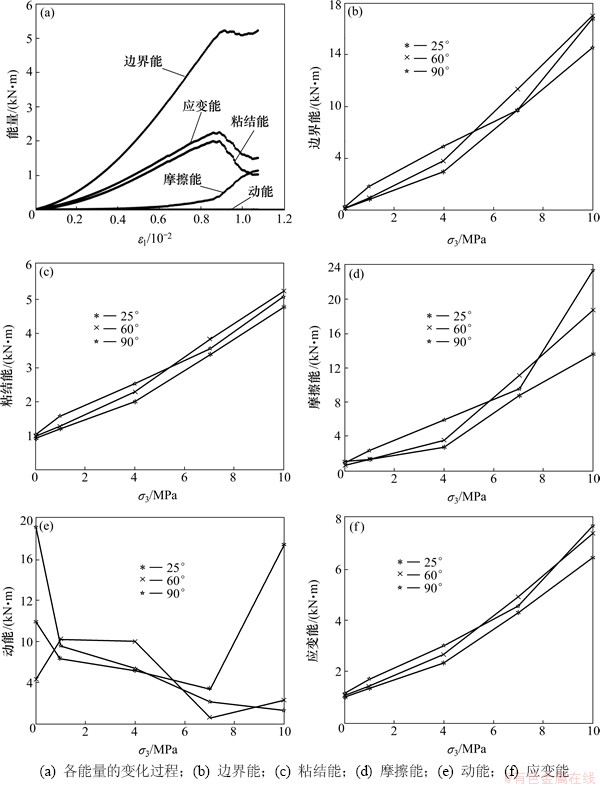 4) 在低围压时,边界能主要用来克服颗粒体的应变能和黏结能,两者大小基本相同。高围压时,外界荷载更多地用来克服颗粒体的应变能。