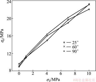 裂纹起始应力σci是以产生稳定张拉裂纹为标志,能反映岩体材料特性的重要参数[16]。通过裂隙体积应变-轴向应变曲线,找到对应裂隙体积应变刚刚开始增加的轴向应力即为σci。然而,该定义是基于岩石均匀性的假定之上,试验上所测的σci往往不准确并有很大的离散性[17]。基于颗粒流数值模型试验,采用Potyondy和Cundall推荐的定义,也就是首先确定峰值应力处细观裂纹的数量n,然后找n×1%的裂纹数量所对应的应力作为σci[18]。本文基于该定义对不同围压下岩体σci变化进行研究,数值试验数据整理结果如图10所示。从图10可见:随着围压的增加,σci也逐渐变大且呈非线性的关系;不同节理倾角的裂纹起始应力并不相同,而且随着围压的提高,这种差异性还一直存在。