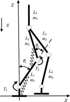 Fig. 1 Improved five-link biped robot model with compliant joint