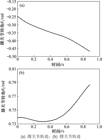 图1所示的5连杆模型参数如下:L1 = L2 = 0.35 m,m1 = m2 = 1.8 kg,m5 = 13 kg,g = 9.8 m/s2,步行周期T=3 s。由于分析左腿支撑相的左腿关节与右腿支撑相的右腿关节采用的方法相同,结果类似,为此,本文以1个步行周期内左腿支撑相左腿踝关节和膝关节为研究对象。根据离线的步态规划可以得到左腿支撑相起始时间点和结束时间点,在这段时间内,其踝关节轨迹和膝关节轨迹变化如图5所示。