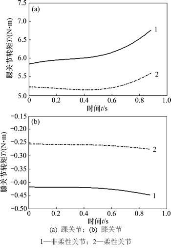 步行机器人各个关节电机有效完成所规划的对应轨迹是其能够实现稳定行走的必要条件。电机的输出转矩作为电机的1个重要性能指标,在很大程度上决定了关节能否实现完整的运动。相对于传统的刚性关节,柔性关节的刚度取决于弹簧阻尼系统的劲度系数。根据关节转角的变化,可以进行插值求解转角与时间的函数关系,通过式(1)计算得到踝关节和膝关节在柔性和刚柔性情况下电机输出转矩的变化,如图6所示(规定关节电机转矩正方向为逆时针方向)。图6中,柔性关节刚度为1 kN/m。
