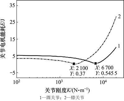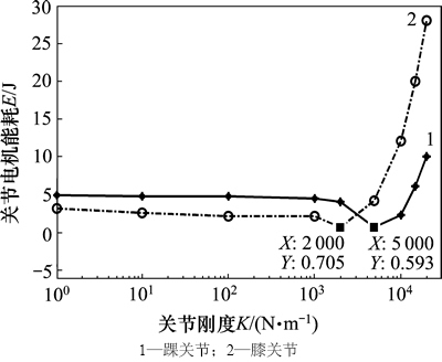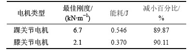 动力学仿真中刚性踝关节和膝关节的电机能耗分别为5.231 J和3.755 J。动力学仿真中柔性关节的最佳刚度、最佳刚度下的电机能耗以及电机能耗减小百分比如表2所示。
