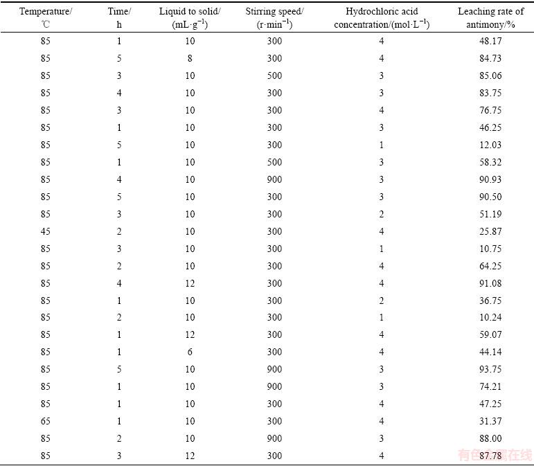 3) 根据所建神经网络模型中不同输入量在网络中节点权重不同,得出相关条件因素对锑浸出率的相对重要性从高到低依次为:盐酸浓度,反应温度,搅拌速度,液固比,反应时间。