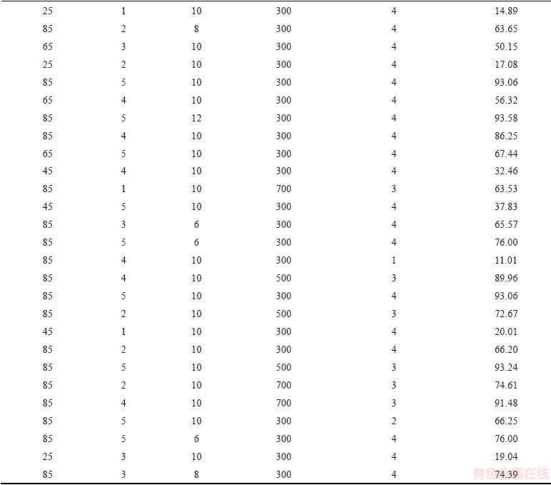 根据式(4)~(13)可以计算出不同输入变量的相对重要性,结果如表5所列。从表5中可以看出,所有变量均对锑的浸出率有较大的影响,其重要性从高到低依次为:盐酸浓度、反应温度、搅拌速度、液固比、反应时间。盐酸浓度的影响主要体现在配位作用,这也与前面配位浸出实验结果相符。因此,选择反应条件时可以根据这一次序进行调整,选择更好的反应条件以达到更高的浸出效果。