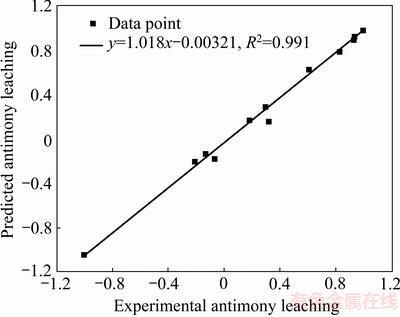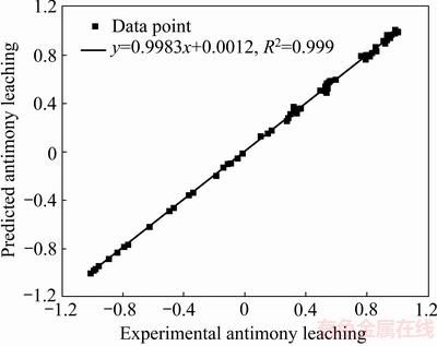从图5中可以看出,误差逆向传播神经网络模型预测值与训练实验值的线性拟合度较高,斜率和相关系数分别为0.998和0.999,接近于1,说明模型的拟合极好。图6所示为神经网络预测值与验证实验结果之间的比较,斜率和相关系数分别为1.018和0.991,接近于1,表明该模型的预测较为可靠,可以用于臭氧协同氧化浸出反应过程中锑的浸出率预测。而图7所示为预测值与预测实验结果之间的比较,斜率和相关系数分别为0.976和0.997,说明所建误差逆向传播人工神经网络模型能够成功预测臭氧协同氧化浸出过程中不同条件下锑的浸出率,是一种具有参考价值和意义的模型。