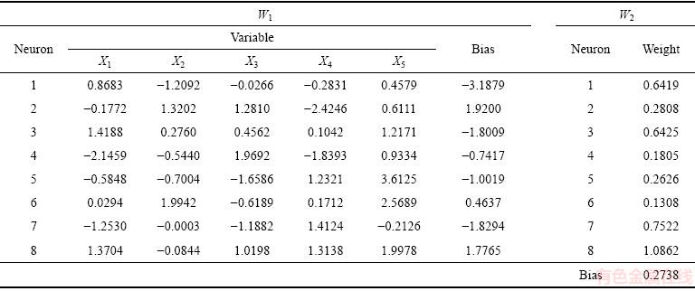 从图3中可以看出,随着节点数从5增加到8,预测性能指标明显提高,之后继续增加节点数,并不能提高网络的预测性能,因此选择隐层节点数8为最佳条件,此时所训练数据的平均方差为8.7×10-4,因此选择单隐层8节点的“5-8-1型”结构用于人工神经网络模型。综上所述,测试数据最小的平均方差的神经网络拓扑结构为三层神经网络(输入层、隐层和输出层),隐层节点数为8,tan-singmoid为隐层转移函数,pureline为输出层函数,人工神经网络结构如图4所示。