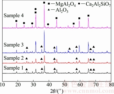 本实验温度范围设计为1100~1500 ℃。在此温度范围内,二次铝灰中铝主要以Al2O3存在[11-13],因此,后续体系中不再出现金属铝。在MgO-CaO-Al2O3-SiO2体系计算中,依据镁铝尖晶石中Al2O3/MgO理论质量比2.53,钙铝黄长石中Al2O3/CaO理论质量比0.91,结合二次铝灰原料中物质含量,设计二次铝灰、氧化钙和氧化镁原料配比。本研究共设计4种配料质量比例(样品1~样品4),具体配料质量分数见表2。