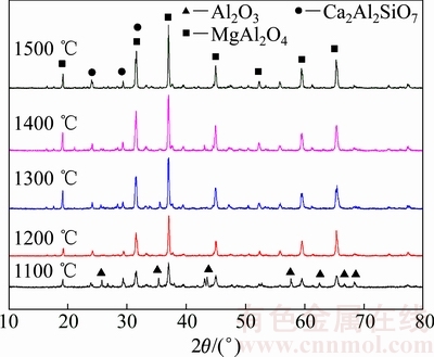 Fig. 4 XRD patterns of gehlenite/magnesia-alumina spinel composites at different temperatures