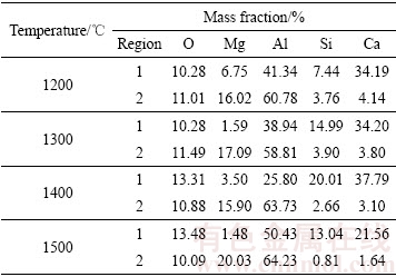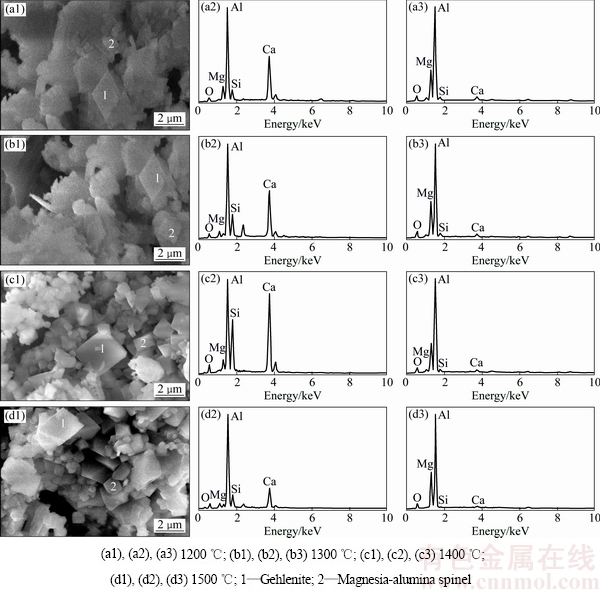 表3 不同烧结温度钙铝黄长石/镁铝尖晶石复相材料中钙铝黄长石和镁铝尖晶石EDS分析