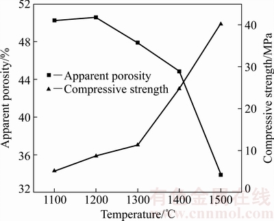 Fig. 6 Effects of sintering temperature on apparent porosity and compressive strength of gehlenite/magnesia-alumina spinel composites