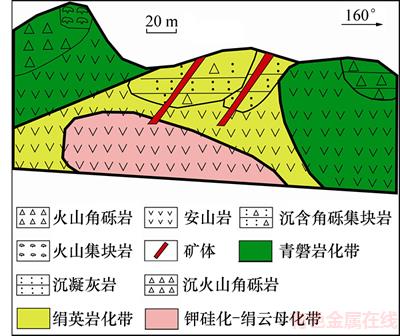 Fig. 4 Simplified map of surface alteration in X-zone of Dongjun mining area
