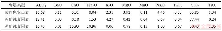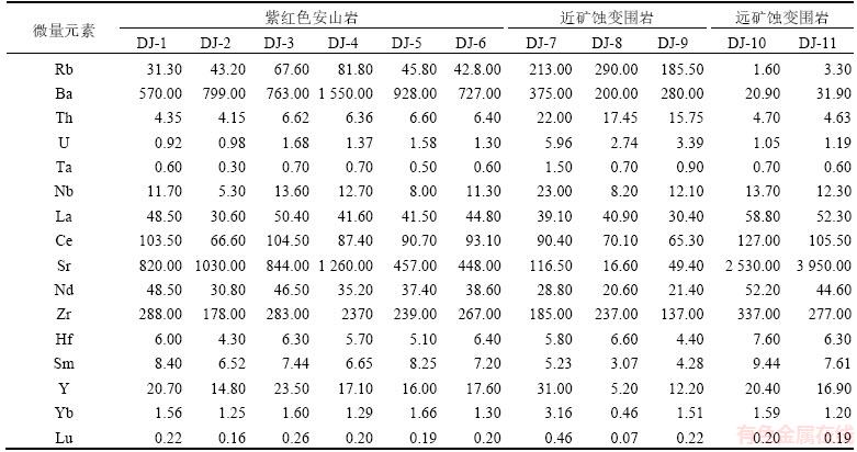 3) 近矿蚀变围岩轻重稀土分馏最强,其次为远矿蚀变围岩,紫红色安山岩稀土元素分馏相对较弱;Eu异常只发生在近矿蚀变围岩中。总体表现为近矿蚀变围岩轻稀土亏损、重稀土富集。远矿蚀变围岩轻稀土富集、重稀土亏损。近矿蚀变围岩主要富集Rb,U,Th,Ta和Nb元素,强烈亏损Ba,Ce,Sr,Nd和Zr元素,其中的La,Ce,Sr,Nd,Zr,Sm和Y元素从近矿围岩中组分流失而在远矿围岩处相对富集。