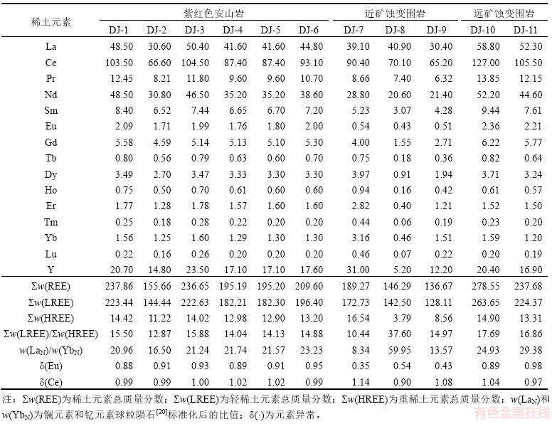 3类岩石的稀土元素数据显示,稀土总量在远矿蚀变围岩最高,在近矿蚀变围岩最低,近矿蚀变围岩轻重稀土分馏最强,其次为远矿蚀变围岩,紫红色安山岩稀土元素分馏相对较弱。Eu异常只发生在近矿蚀变围岩中。