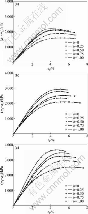 Fig.1 presents the relationship between σ1-σ3 and major principal strain ε1 for the coarse-grained soil at different values of b and σ3. It can be seen that the strength is the lowest for the conventional triaxial compression (b=0) under a given σ3. In general, the strength increases with the increase of σ3 for a given value of b except that the strength decreases with increasing value of b from 0.75 to 1.00 at σ3=200 kPa, as shown in Fig.1(a).