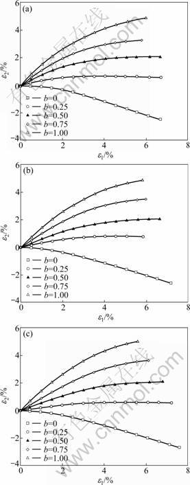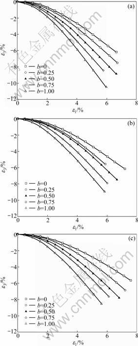 The relationship curves between intermediate principal strain ε2 and major principal strain ε1 are plotted in Fig.2. The figure shows that the intermediate principal strains are negative when b is equal to zero and positive when b varies from 0.25 to unity. Here, negative strain means expansion. With the increase of parameter b, ε2 increases considerably.