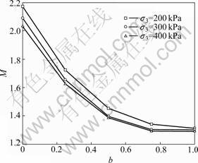 Fig.5 Variation of peak stress ratio (M) at failure with b at different σ3 values