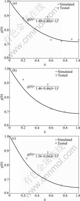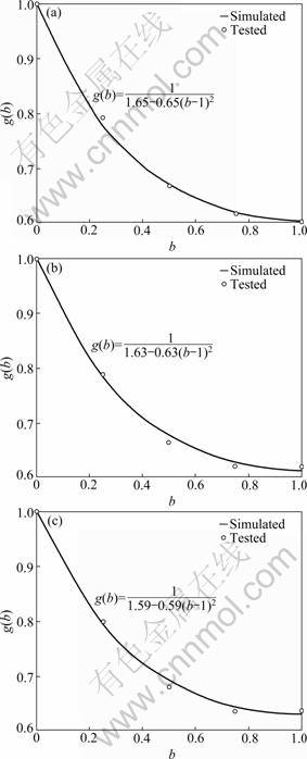 In order to verify Eq.(6), the relationships between g(b) and b obtained from the true triaxial tests for loose sand and dense sands performed by LADE and DUNCAN [12] and for fine gravel performed by SHI et al [24] were simulated by Eq.(6), as shown in Fig.7. For loose sand, k=0.40 in Fig.7(a), k=0.46 in Fig.7(b) for dense sand, and k=0.56 in Fig.7(c) for fine gravel (Table 2). It can be seen that the simulated results by Eq.(6) are in good agreement with the tested results for loose sand, dense sand and fine gravel.