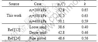 related to the friction angle. As a result, g(b) is assumed to relate to b and φc. Using Eq.(3) and φ0=55.6?, Δφ=9.2?, φc can be found for the tested soil at σ3=200, 300 and 400 kPa, as listed in Table 2.