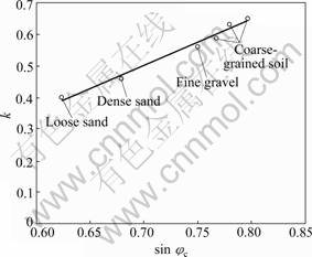 The relationship between k and φc is plotted on k- sin φc plane using data in Table 2, as shown in Fig.8. It is found that the relationship between k and sin φc is linear and can be fitted by