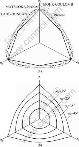 Eq.(6) can reflect the effect of σ2. The shapes of failure criteria on π-plane are shown in Fig.9. For convenient comparison, the shapes of LADE-DUNCAN, MATSUOKA-NAKAI and MOHR-COULOMB criteria are also presented in Fig.9(a). It shows that the current criterion is located between LADE-DUNCAN and MOHR-COULOMB criteria.