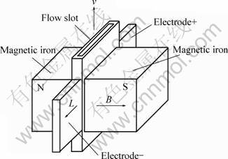 Fig.1 Operating principle of AC electromagnetic pump (J—Current density that is perpendicular to magnetic induction intensity and flowing direction of metal liquid; B—Flowing direction of magnetic induction intensity that is perpendicular to current direction and metal liquid; L—Length of metal liquid that lies in cleft of electromagnet)