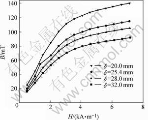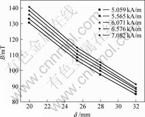 The size of magnetic induction intensity B in airgap is measured with SG-3-A type digital T meter in experiment, whose measuring range is (200±0.1) mT. A group of selected samples are used to investigate the influence of airgap’s width on magnetic induction intensity. Magnet cores sectional area S and centerline perimeter L0 in the structure parameter of four samples are unchanged, namely S=41 mm×41 mm, L0=1 020 mm. Only the width of airgap δ is changed, such as 20 mm, 25.4 mm, 28 mm and 32 mm. The change of magnetic induction intensity B in airgap in different magnetization H is measured. Fig.3 indicates that the curve based on magnetization H in connection with magnetic induction intensity B. Fig.3 suggests the width of airgap (δ) affects magnetic induction intensity B greatly in airgap, whereas it is inconspicuous toward the slope coefficient of saturated stage. The relationship between the width of airgap (δ) in saturated stage and magnetic induction intensity B in airgap is also non-linear, as shown in in Fig.4.