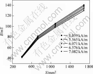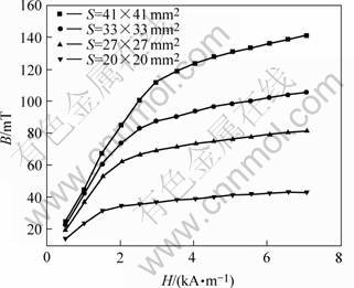 Another group of samples in experiment are selected. The sectional area S of magnet cores is sorted into 20 mm×20 mm, 27 mm×27 mm, 33 mm×33 mm, 41 mm×41 mm. The centerline perimeter L0 in magnet and the width of airgap are unchangeable, namely L0= 1 020 mm, δ= 20 mm. The changeable situation of magnetic induction intensity B in airgap center along with the magnetization H is measured. Fig.5 presents the curve based on magnetization H in connection with magnetic induction intensity B. Fig.5 also shows that magnet cores sectional area S has apparent influence on the magnetic induction intensity B in airgap.