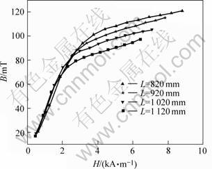 Another four samples in experiment are selected. The sectional area S of magnet cores is 33 mm×33 mm, and the width of air gap is 20 mm. The centerline perimeter L0 in magnet is sorted into 820 mm, 920 mm, 1 020 mm and 1 120 mm. Fig.7 presents the curve based on magnetization H in connection with magnetic induction intensity B. According to the length of the centerline perimeter, each curve in magnet follows magnetization law, including initiative magnetization stage, irreversible magnetization stage and saturated magnetization stage, as shown in Fig.7. Compared with the curve of magnet core’s magnetization, the slope coefficient in irreversible magnetization stage is decreased; while the slope coefficient in saturated magnetization stage is increased. These result from dispersive magnetic field in airgap. Magnetic induction intensity B in a certain magnetization and the centerline perimeter L0 in magnet are selected to make out a relation curve, as shown in Fig.8. It is clear that the relationship between the centerline perimeter L0 in magnet and magnetic induction intensity B in airgap is non-linear.
