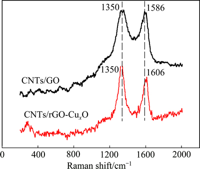 图2所示为CNTs/GO和CNTs/GO-Cu/Cu2O的拉曼光谱。从图2可以发现,CNTs/GO分别在1350和1586 cm-1处出现峰值,分别对应着GO的D峰和G峰,它们分别是由GO的缺陷与C—C环引起的;而对于CNTs/GO-Cu/Cu2O复合颗粒而言,D峰和G峰的位置分别在1350和1606 cm-1处,显然,此时的G峰出现了蓝移现象,这是由于形成了新的rGO区域。这说明经过微波热处理后,GO上的含氧基团减少,GO在一定程度上已经热还原为rGO。