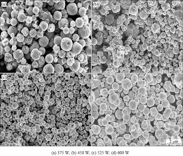 Fig. 4 Effect of microwave power on composite particles morphologies